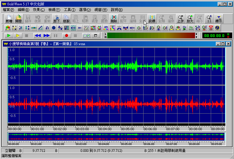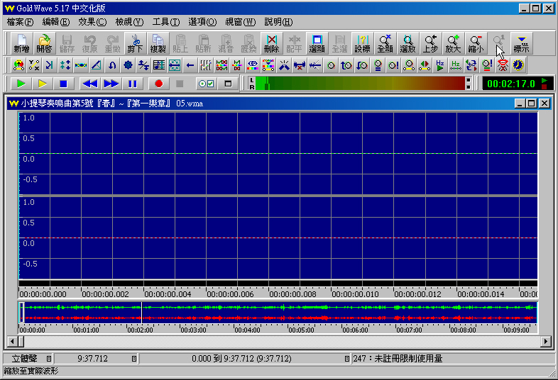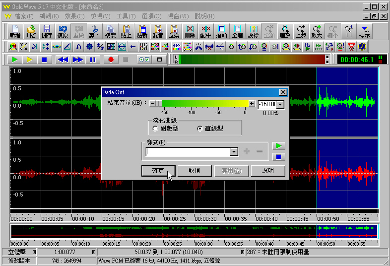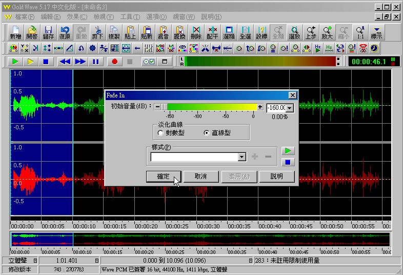 1. 若選取的音樂是用在戲劇配音時,直接使用可能會顯得突兀(特殊音效除外),有時需要將頭尾處加以淡入、淡出處理(本例在頭尾處加以淡入、淡出處理各十秒鐘)