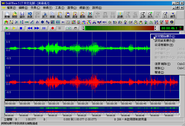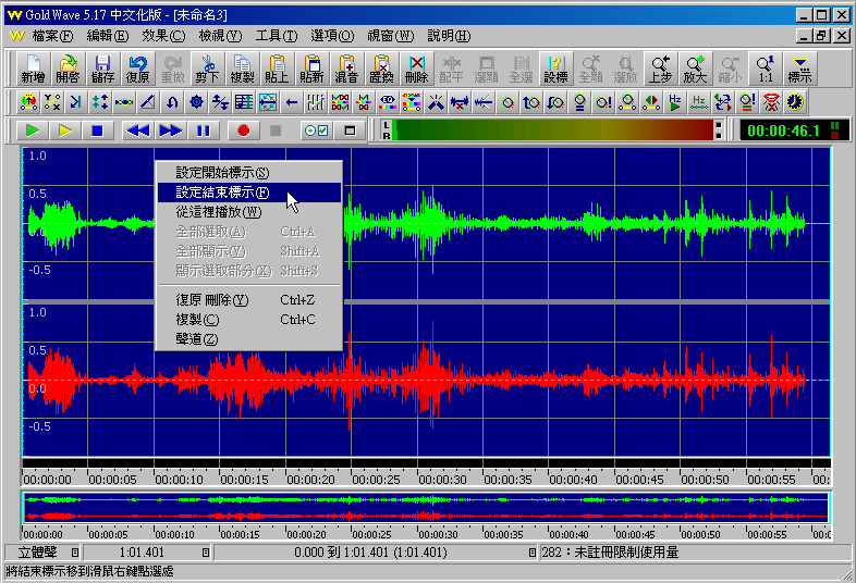 2. 假設擷取其中60秒,在全選狀態下(藍底),滑鼠指標移至開始位置,用右鍵→設定開始標示,此時開始時間前會呈現黑色;滑鼠指標移至結束位置,用右鍵→設定結束標示,此時結束時間之後會呈現黑色→可先播放試聽,確定再進行下一步