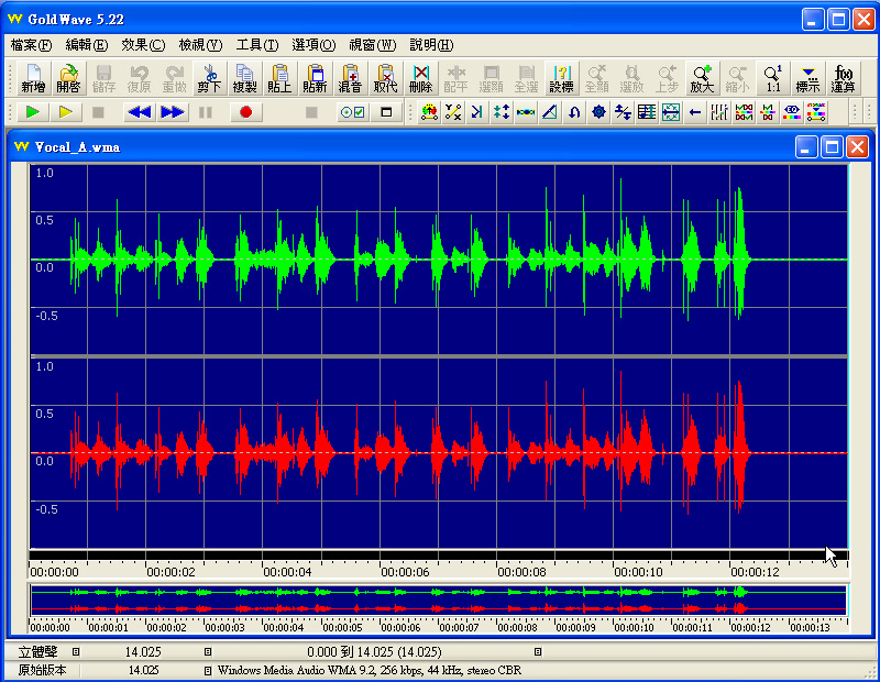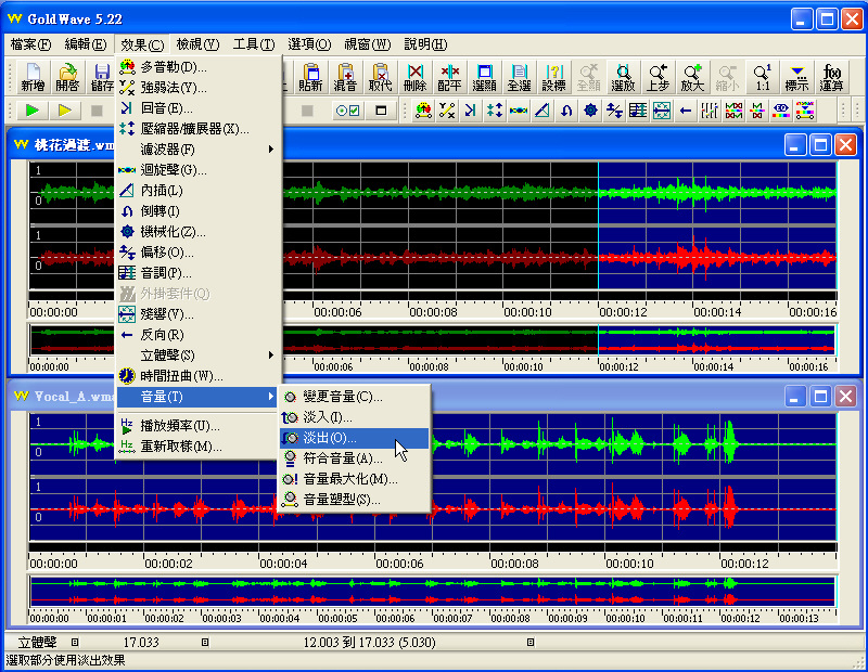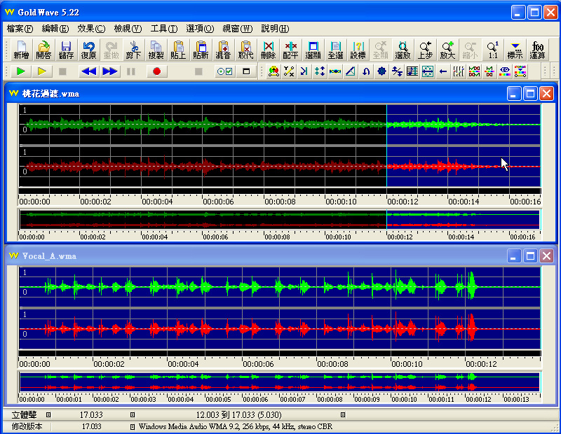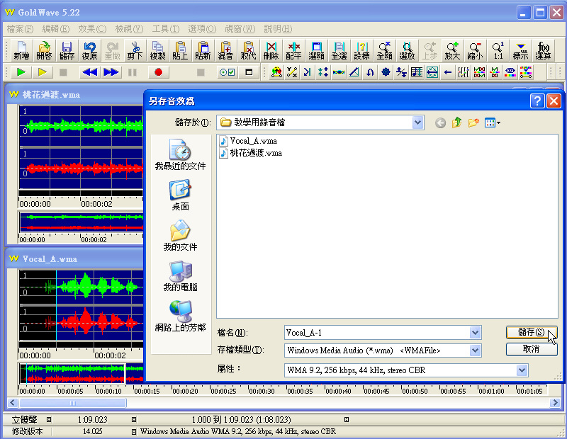4. 先處理人聲檔:點選人聲檔視窗→平衡音量,多人錄音個別音量調整→消除空白處雜音→存檔→儲存成wma, 256kbps 44kHz(高品質格式)