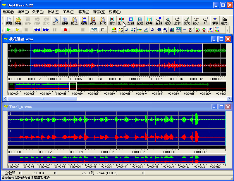 Vocal_A.wma music_A.wma(桃花過渡) Vocal_A-1.wma 已錄製人聲(VocalA)檔案 音樂(MusicA)檔案 混音後檔案 1. 開啟GoldWave程式