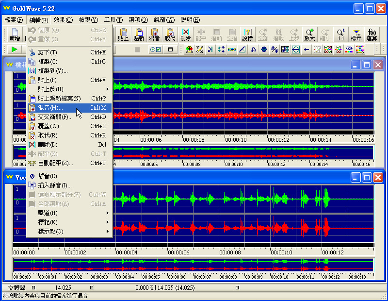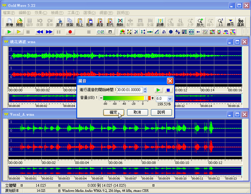 7. 點選音樂檔視窗→右鍵→複製→點選人聲檔視窗→編輯→混音→彈出混音對話方塊→輸入混音時間點→混入音樂檔音量增益調整(單位為dB)→試聽目前設定→修改設定(混音時間點、音量增益)→確定