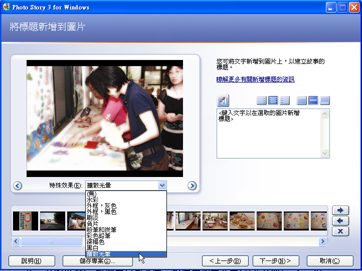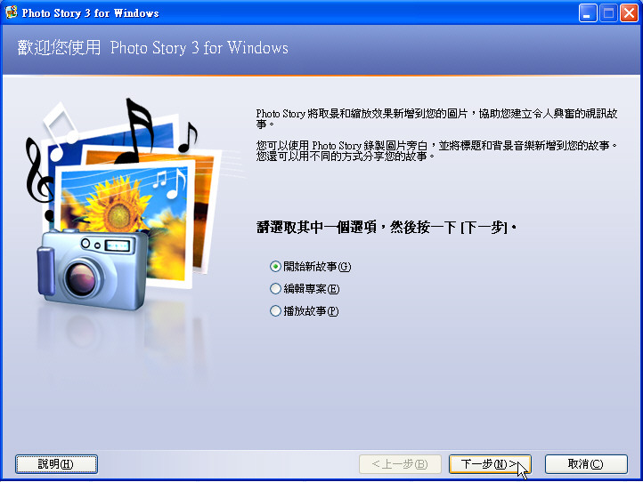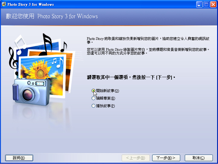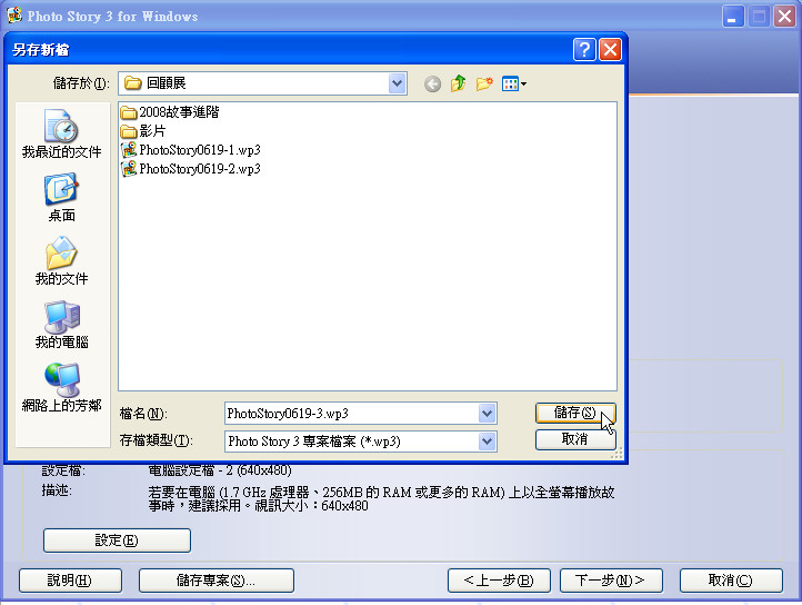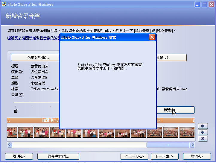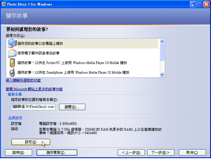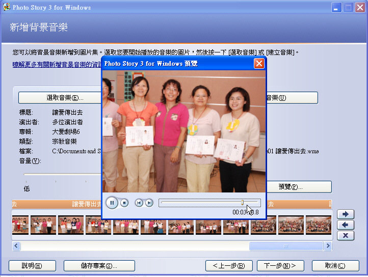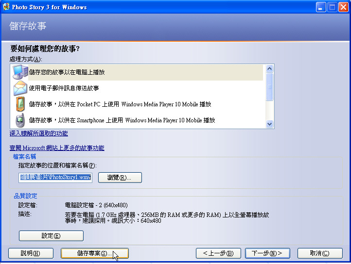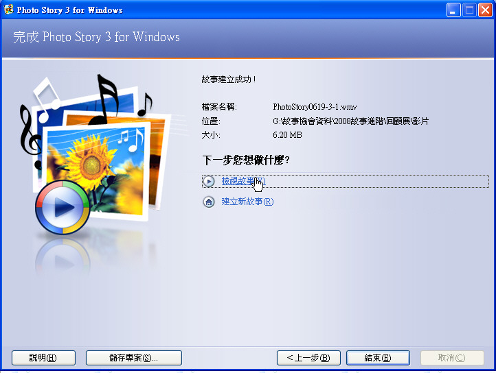 完成Photo Story 3 for Windows,可選擇檢視故事,觀賞製作完成的影片,影片檔格式為wmv(windows