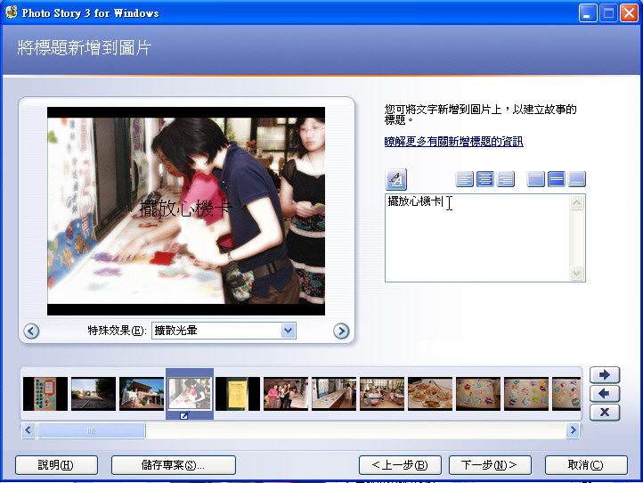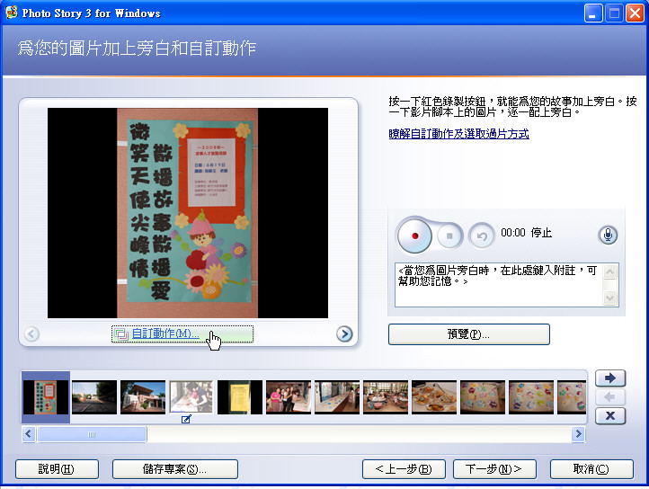 動作效果(在輸入文字後預設動作效果會消失,必須重設)→錄製旁白可在每一張圖片加聲音旁白(非必要)→下一步