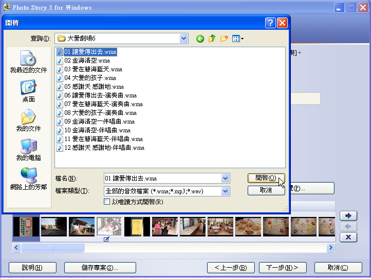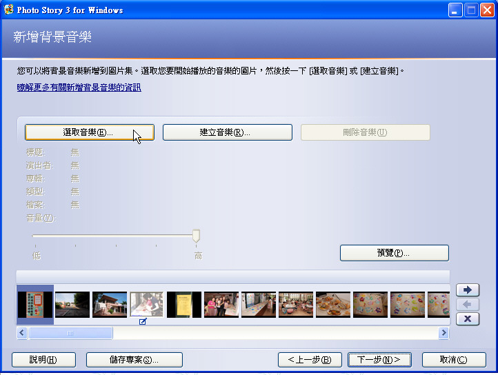7. 選取音樂,可選擇多個音樂檔,視影片長度而定→選擇開始播放音樂的圖片(通常為第一張圖片)→選取音樂→選取資料夾→選取音樂檔,相容的聲音檔格式有wma、mp3、wav檔→開啟→調整音量