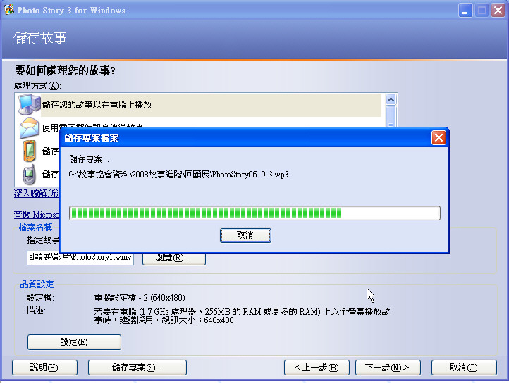 9. 儲存故事:儲存成影片檔,選擇處理方式,選擇儲存您的故事以在電腦上撥放→指定故事的位置和檔案名稱→品質設定