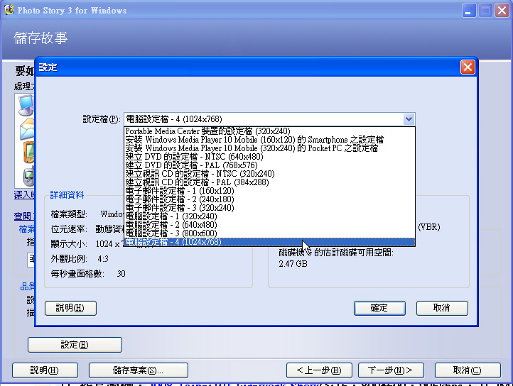 選擇1024*768適合螢幕解析度為1024*768的設定狀態,畫質最佳的設定,但有電腦硬體需求(3.2GHz、512MB的RAM),若電腦硬體資源不及可先儲存專案檔以及關閉其他應用程式後嘗試看看