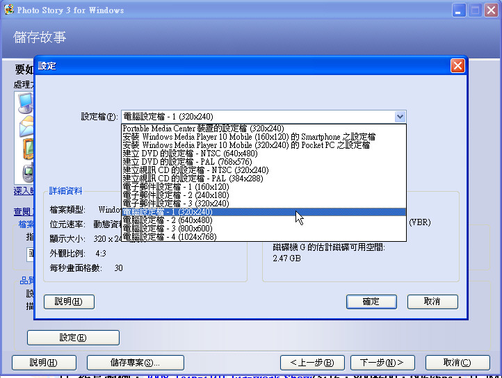 選擇320*240適合網頁傳輸瀏覽,解析度及畫質較差,電腦硬體需求等級較低(700MHz、256MB的RAM)