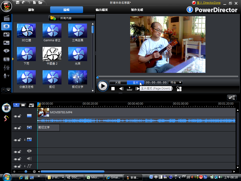 7. 特效工房,可將影片加上特效,內建有96種特效,將與使用之特效拖曳至特效軌上,調整位置至要加上特效之影片段落,並調整特效延續時間長度